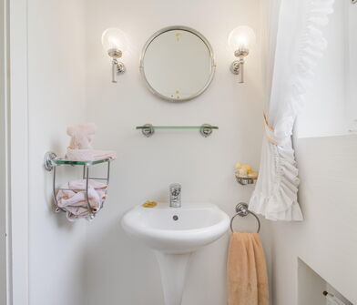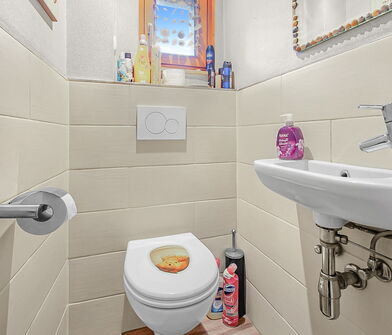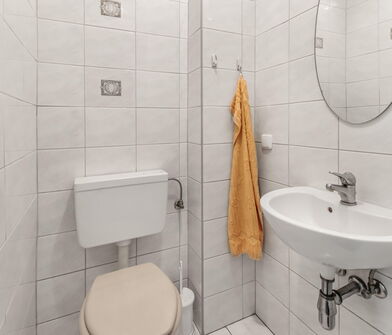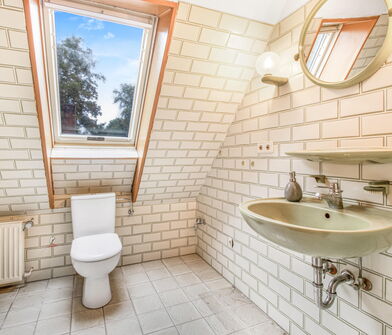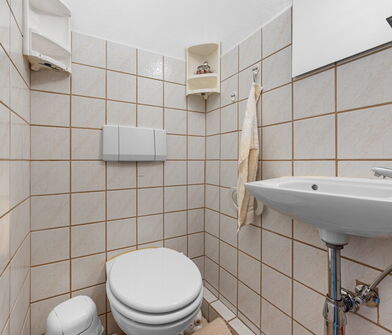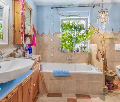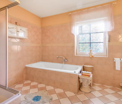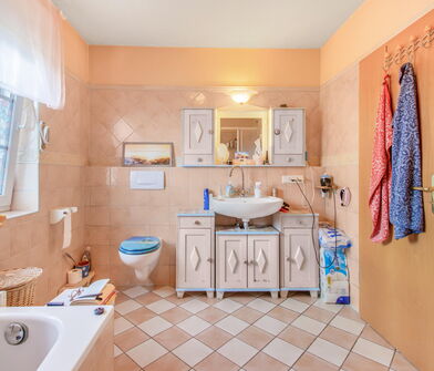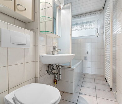 Im Badezimmer sind die Wände bis zu 1,50m ebenfalls mit Fliesen verkleidet.