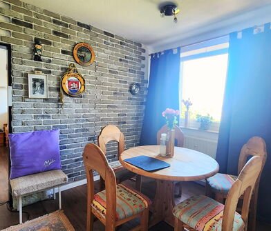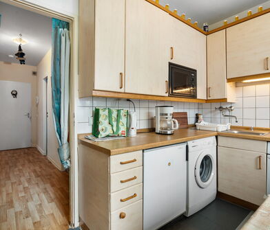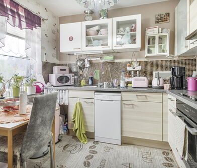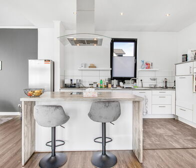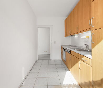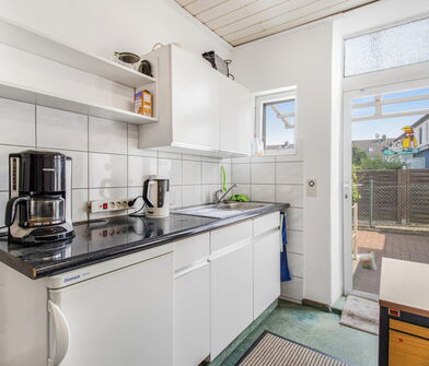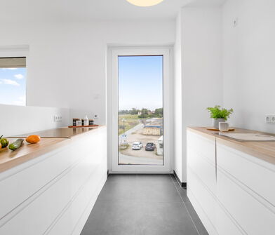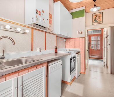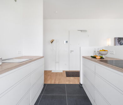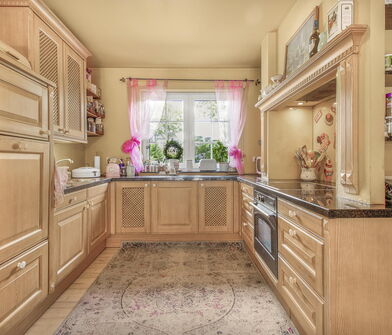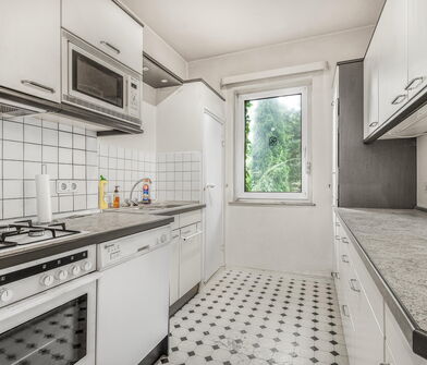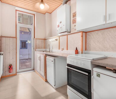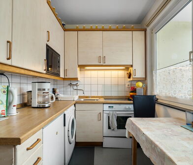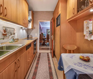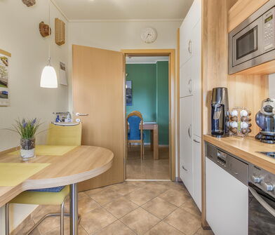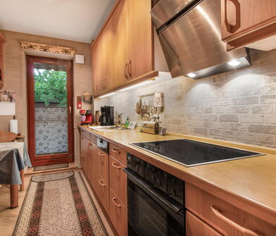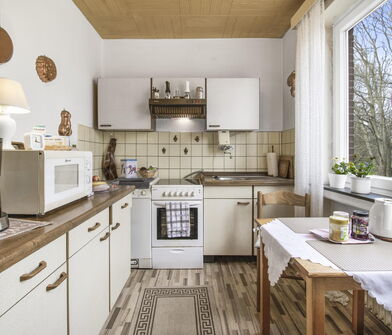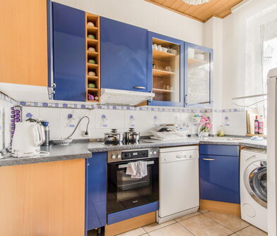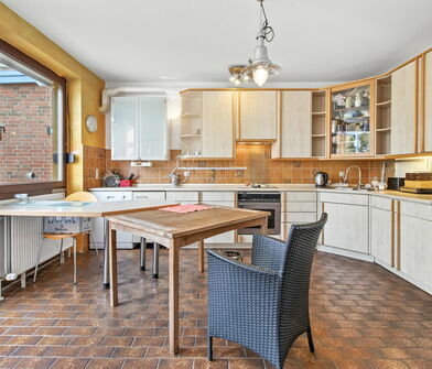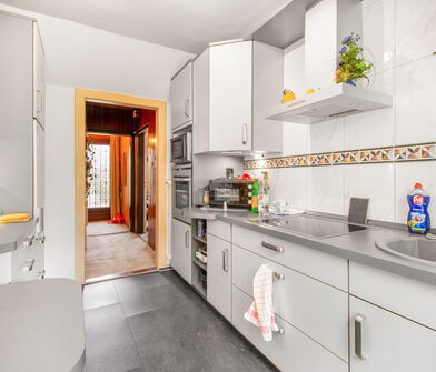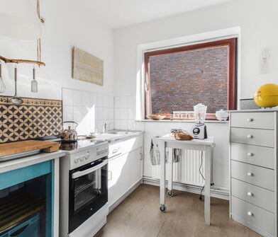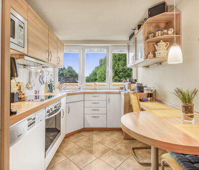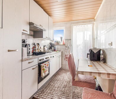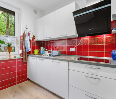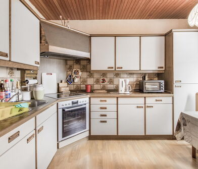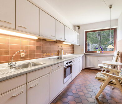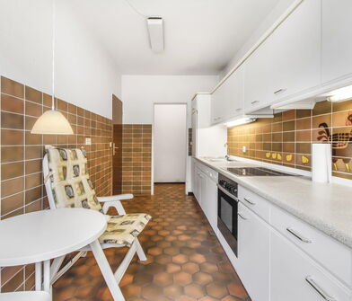 In der Küche sind die Wände im Bereich der Arbeitsfläche mit Fliesen verkleidet.