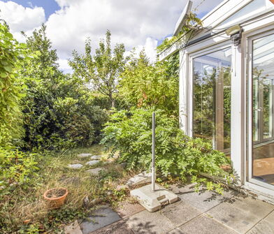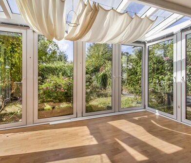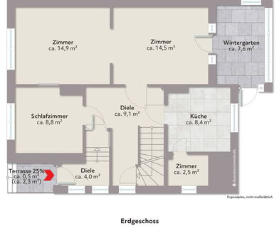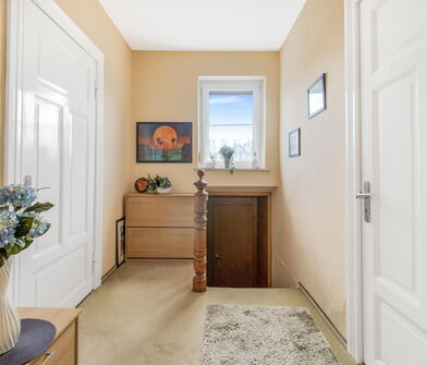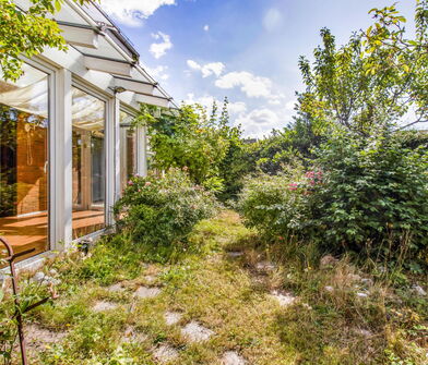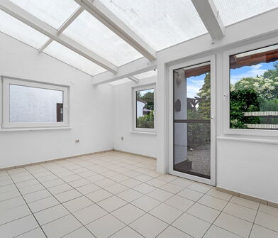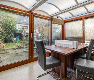 Das Erdgeschoss umfasst ein helles, geräumiges Wohnzimmer, eine separate Küche, einen Flur sowie ein großes Badezimmer und den Aufgang zum Obergeschoss. Durch die Küche gelangt man in den Wintergarten.