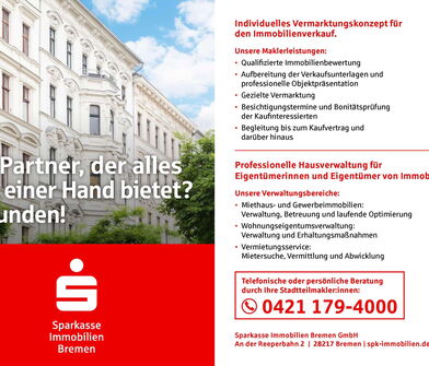 Diese attraktive Immobilie liegt in einer ruhigen Seitenstraße im beliebten Stadtteil Bremen-Findorff. Einkaufsmöglichkeiten, Ärzte, Schulen und Kindergärten sind bequem zu Fuß erreichbar. Die Anbindungen an den öffentlichen Nahverkehr durch die BSAG sowie der Bremer Hauptbahnhof sind nur wenige Gehminuten entfernt. Darüber hinaus ist die Universität Bremen schnell erreichbar und der Bremer Bürgerpark, eine der schönsten Grünanlagen der Stadt, befindet sich ebenfalls in unmittelbarer Nähe.